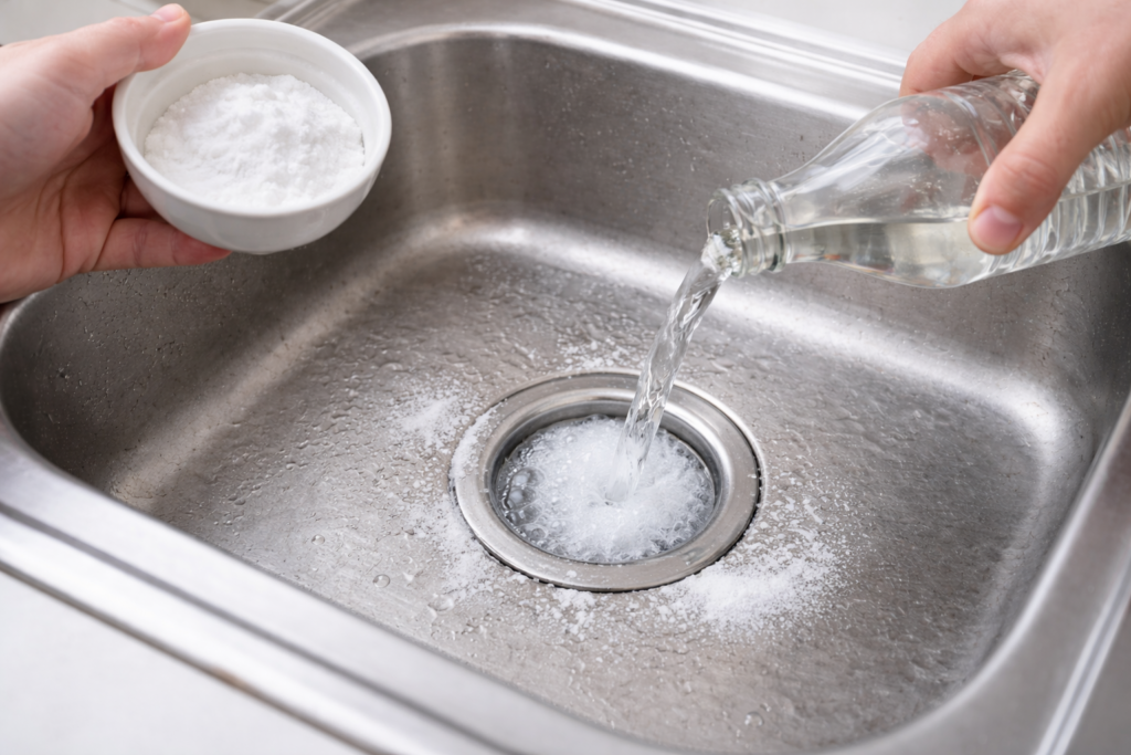 If hot water alone doesn’t fix the problem, the baking soda and vinegar method is one of the most trusted natural ways to unclog a kitchen sink. This simple reaction has been used for years because it is affordable, widely available, and safe for most household plumbing systems when used correctly.