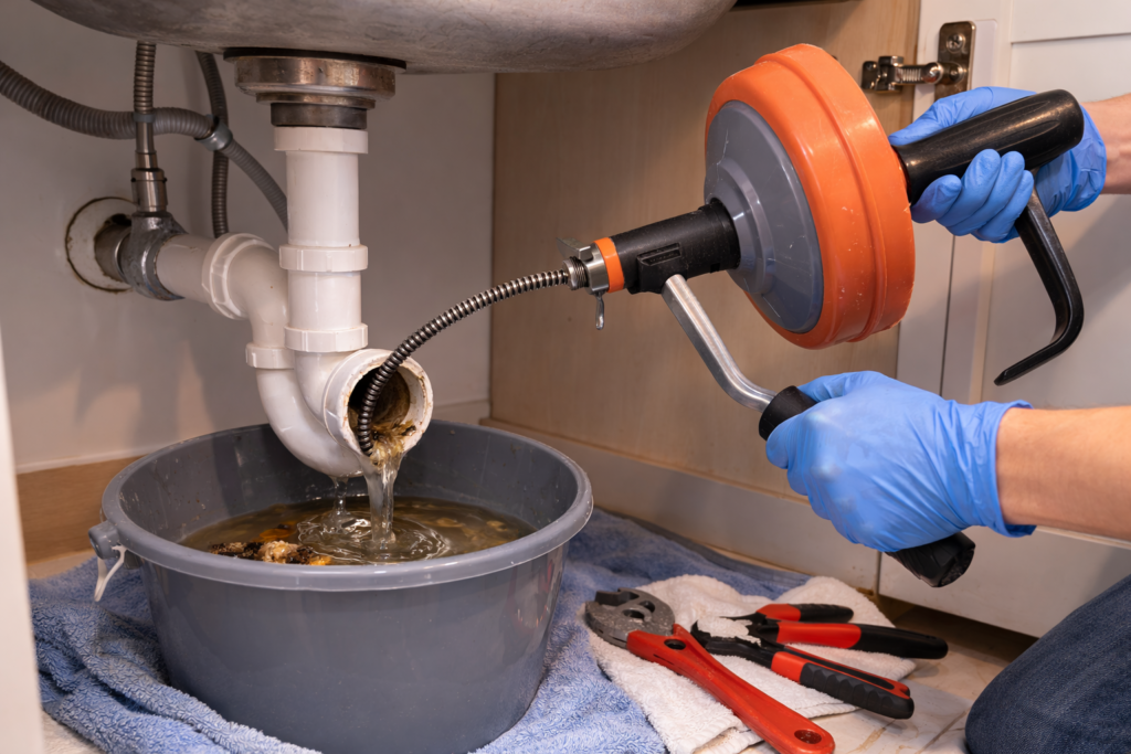 If your kitchen sink is still not draining after trying hot water, plunging, and cleaning the P-trap, the clog is likely sitting deeper inside the drain line. At this stage, a drain auger can be one of the most effective tools you can use. Unlike a small plastic snake, a drain auger is longer, stronger, and designed to reach several feet into the pipe.